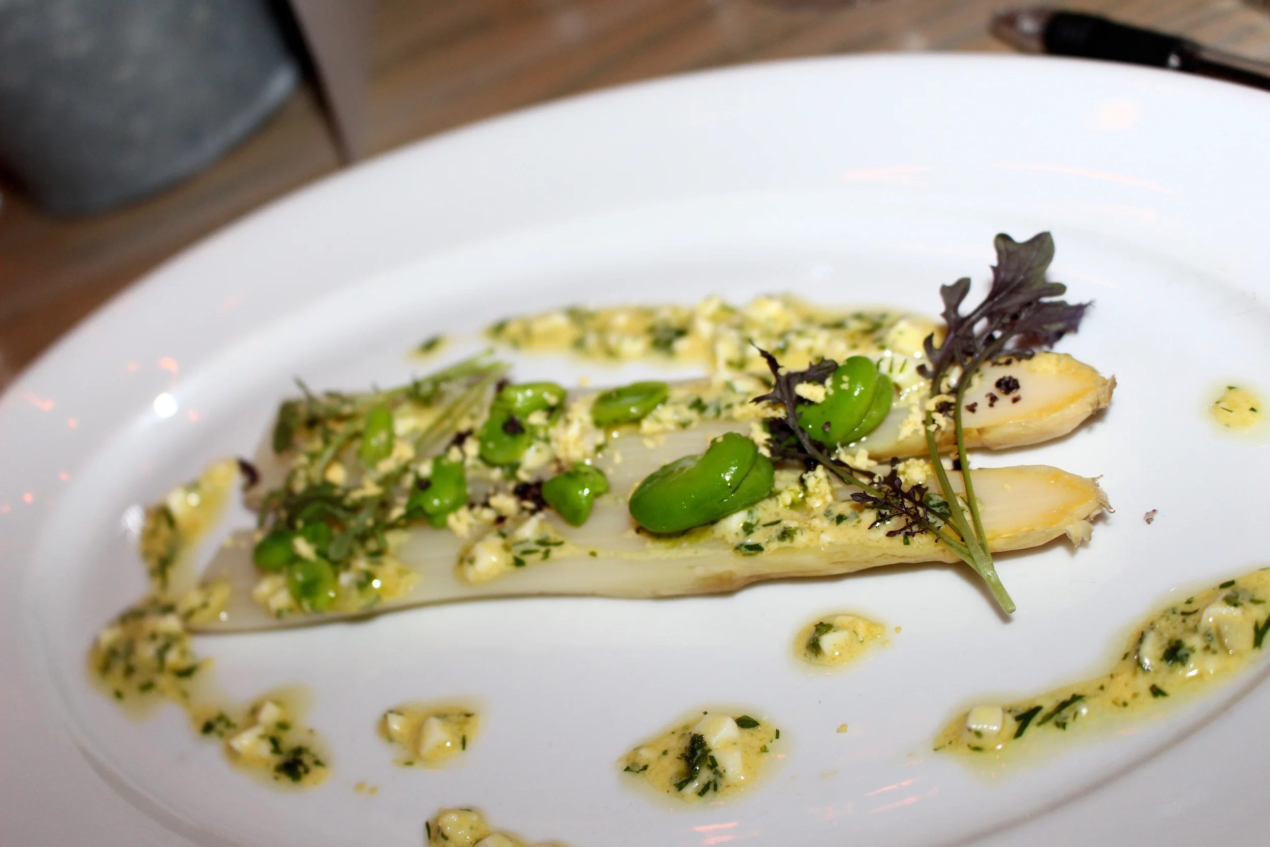 Next, a happy, bright green garlic scape soup (huitres fumee), dolloped with unexpected pickled oysters, followed by a refreshing, spring-forward salad of tender white asparagus imported from France (available through May). Next, a silky, rectangular tartare of organic salmon topped with a layer of avocado cremeux and tiny, tangy bits of green apple.