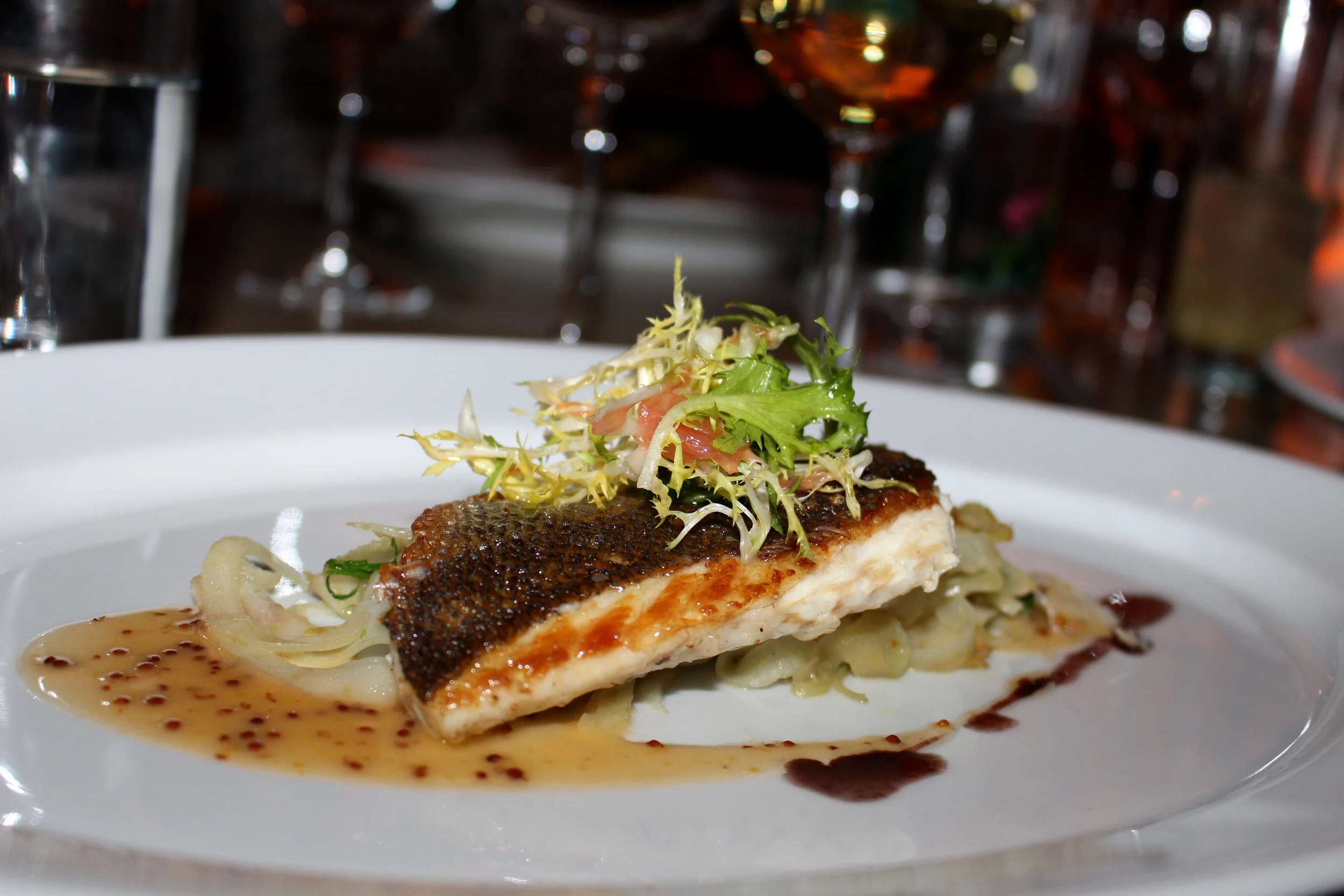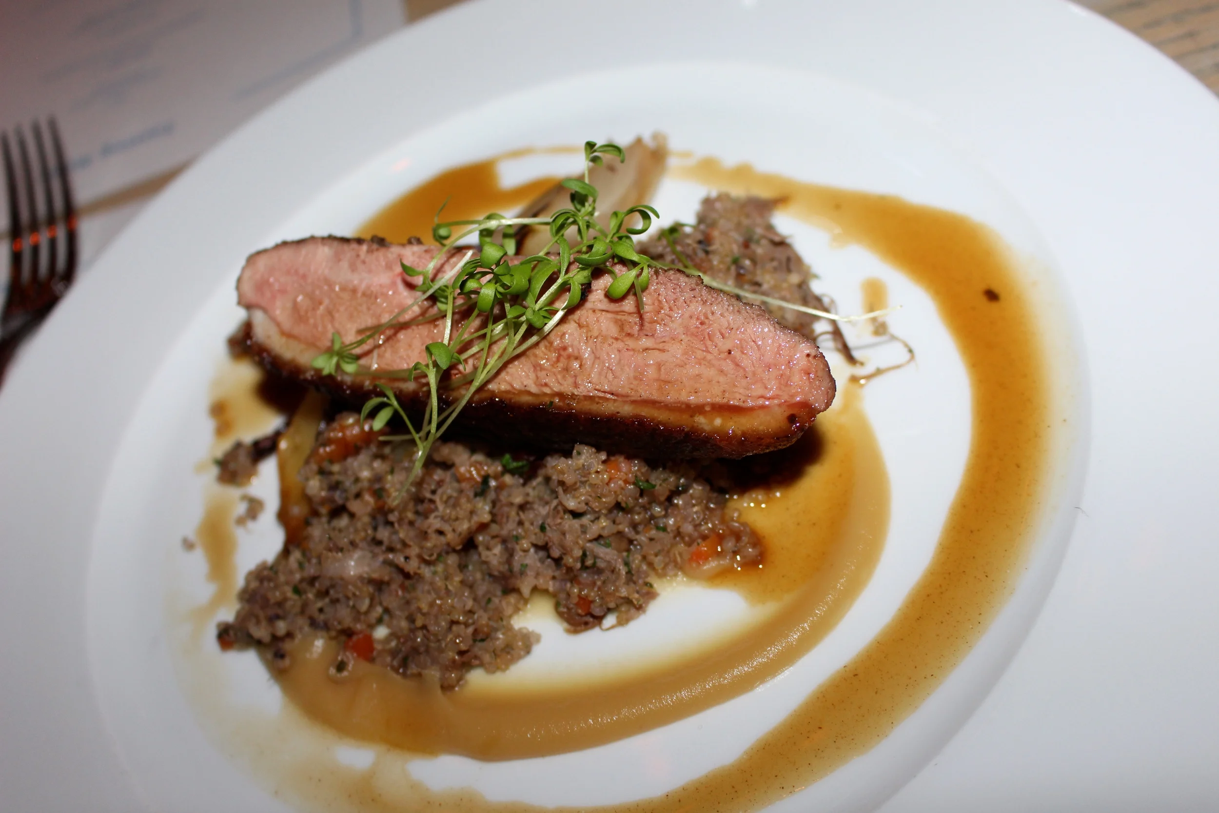 The fish, roasted Branzino, was set atop a fennel fricasee, and a highly complimentary, slightly tangy, grapefruit pommery emulsion. The spiced duck steak was cooked perfectly, and accompanied with a roasted endive stuffed with apple slivers, and toasted walnut quinoa.
